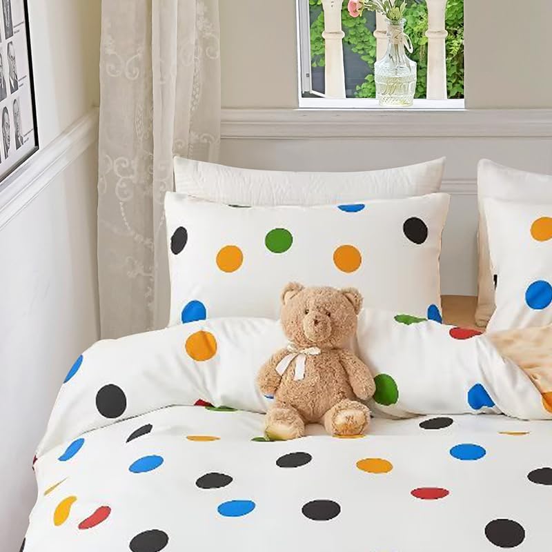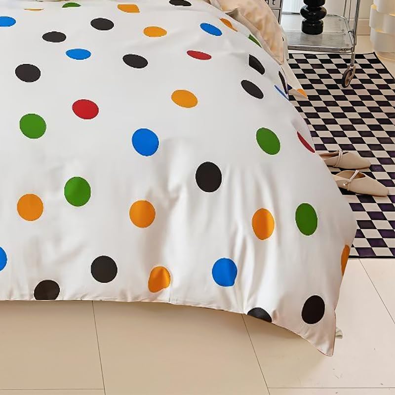 Bring a burst of vibrant colors into your bedroom with this 100% Egyptian Cotton Duvet Set from Gem Lifestyle. The modern polka dot print features a lively mix of black, orange, blue, green, and red dots on a crisp white background, adding a playful and energetic touch to your bedding. The duvet cover and two shams are crafted from premium Egyptian cotton, ensuring softness and breathability for a comfortable night's sleep. With its eye-catching design and high-quality materials, this duvet set promises to transform your bedroom into a cheerful and inviting space. Coordinate with complementary decor pieces for a cohesive and stylish look. Machine washable for easy care.