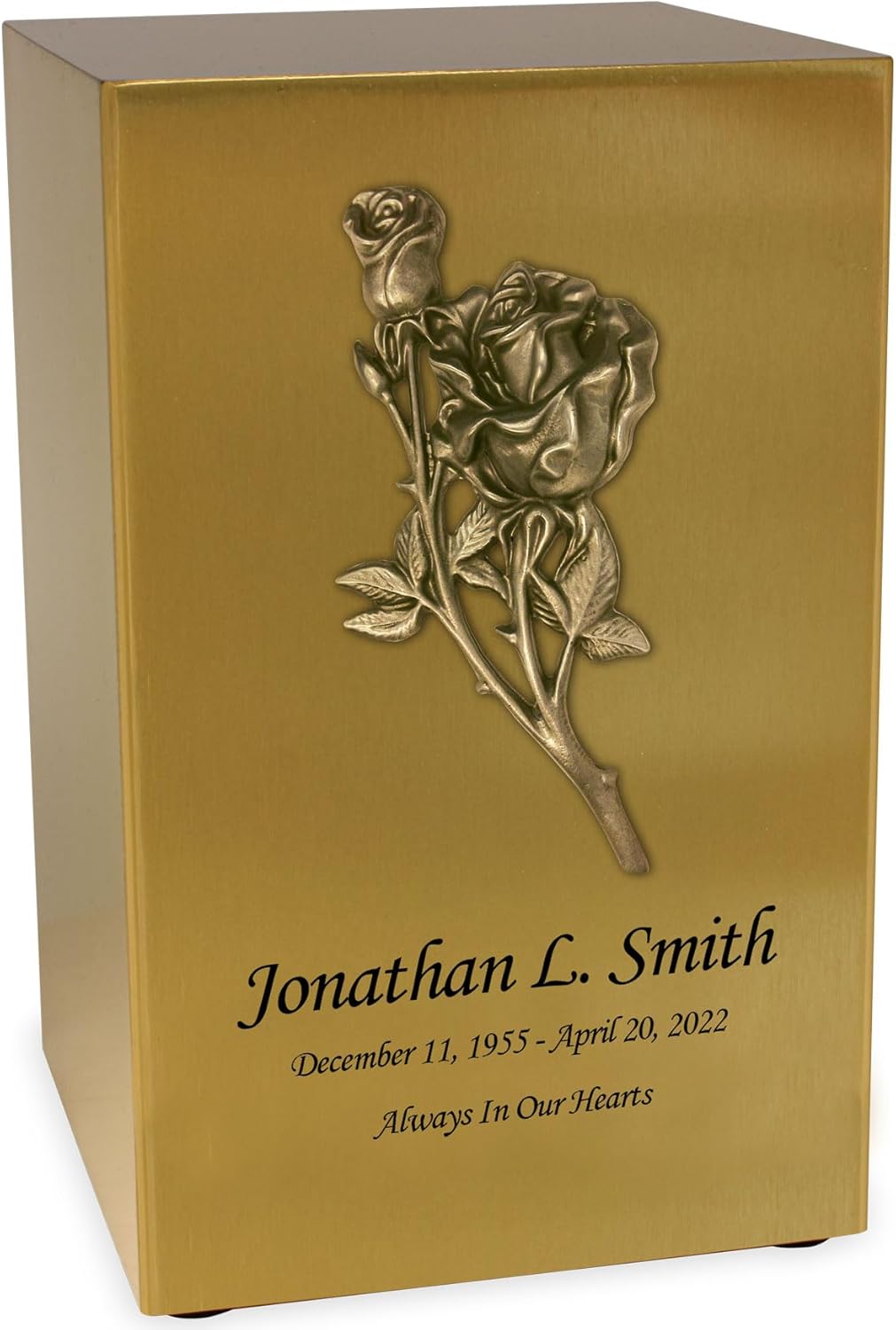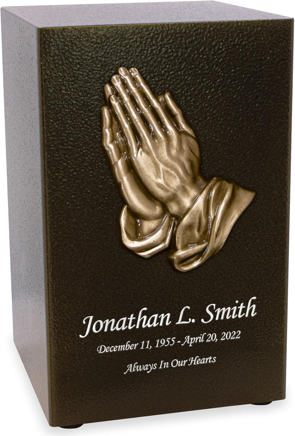 This beautiful bronze finish cremation urn features a 3-dimensional with bronze finish mitered cross applique offering a timeless tribute for your loved one. It measures 5.2" wide x 5.2" deep x 8.3" tall with a capacity of 200 cubic inches which can hold the cremains for someone with a healthy living body weight up to 200 pounds. This rectangular shaped cremation urn is coated with a bronze finish, and features four rubber feet to prevent marking and scratching of surfaces. The easy access bottom closure seals via four screws, providing a safe and secure final resting place for your loved ones cremains. With its beauty and size, this urn is suitable for display on a shelf or table in your home. The urn is also ideally sized for placement inside a cemetery niche. The mitered cross applique is available in two tones, pewter and bronze, allowing you to match the applique to the finish of your urn. This bronze urn can be personalized with up to 40 characters per line for name, date, and sentiment.