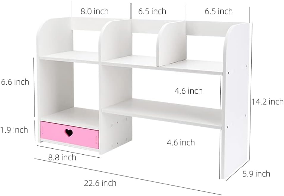Simple and stylish design to keep your desk clean and orderly, providing a new storage experience. Multiple compartments for organized storage, allowing you to categorize items. Heart-shaped cutout handles for convenience and to add a touch of elegance to your bookshelf. Thickened materials for increased weight capacity Easy installation process, so you can start using it in no time.