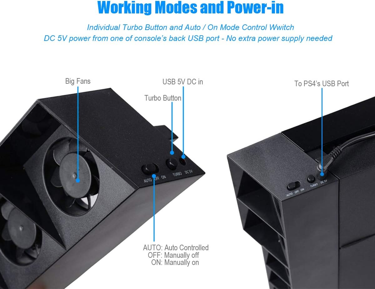 Designed for 1st Generation PlayStation 4 5x Mini and Effective Turbo Cooling Fans Manual and Automatic with Turbo Mode 1x USB3.0 and 4x USB2.0 Adapter Hub Automatic Control at Turning Point 38℃ Balanced Airflow Volume and Noise Level Easy Tool-free Snap-on Installation Specifications: Product: PS4 Combo kit Working Voltage: DC 5V Working Current: 600mA USB Ports: USB3.0*1 and USB2.0*4 with 5 LEDs Material: ABS Import Notes: 1.Compatible with original fat ✅PS4 CUH-1xxx alone. It does Not fit thin ❌PlayStation 4 Slim CUH-2xxx, nor does ❌PS4 Pro edition CUH-7xxx 2.Please fasten it tight onto the console, or abnormal noise will produce Packaging: 1* Turbo Cooling Fan (for first gen of PS4) 1* 5-port USB Hub (for first gen of PS4) 1* USB cable 1* Manual