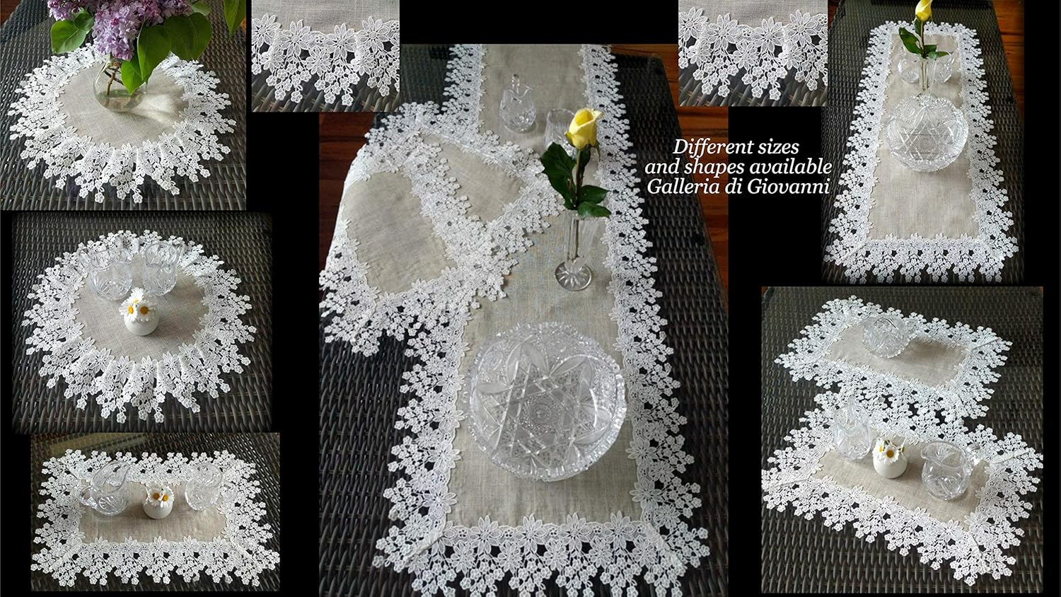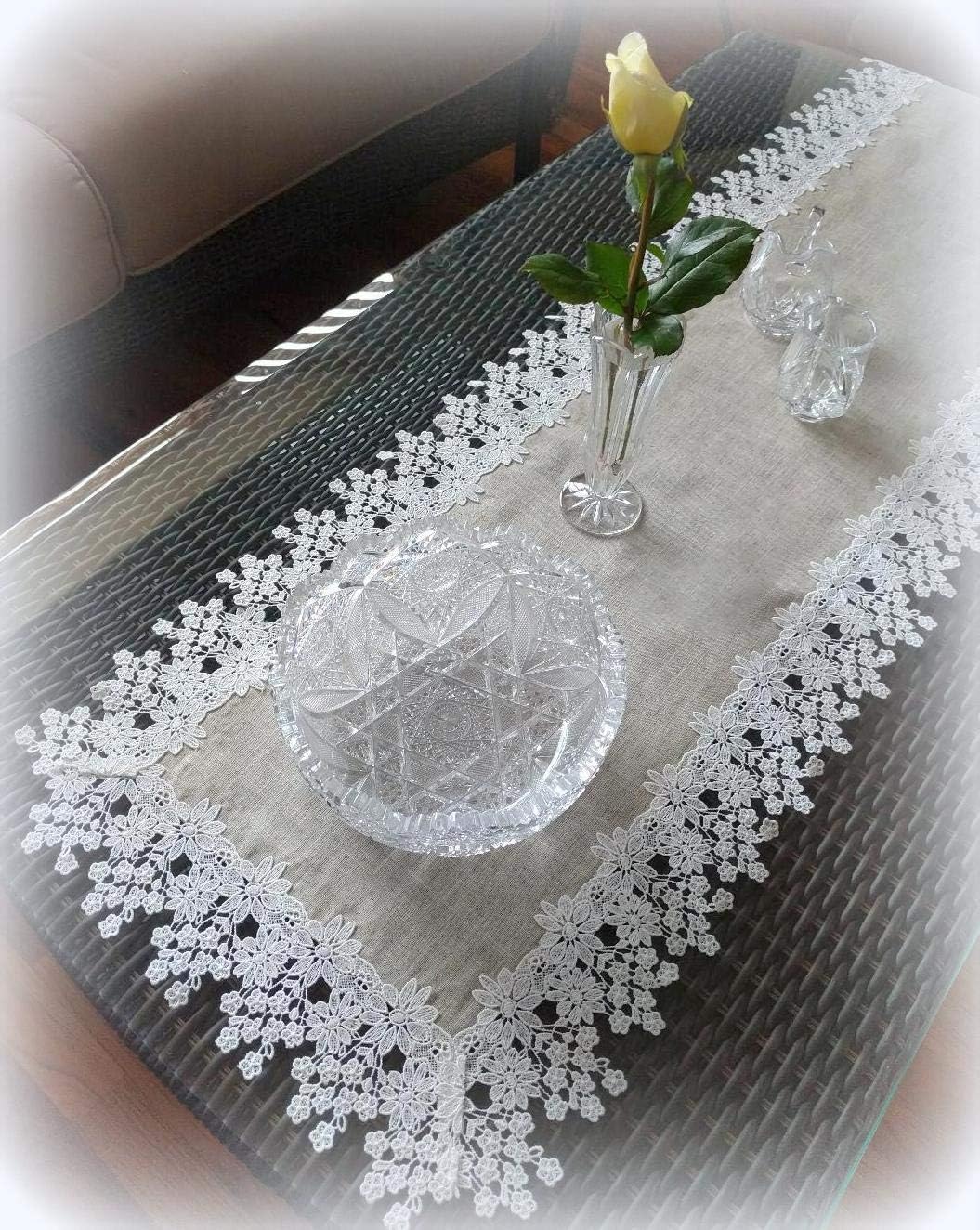 This lace is a natural off white cream and the main fabric has a beige burlap appearance. It is perfect for today's natural decor style of decorating that is clean and simple. Looks beautiful with plants. The earth tones in this design will be perfect year around. Easy for gift giving, and would make fabulous rustic wedding decor.