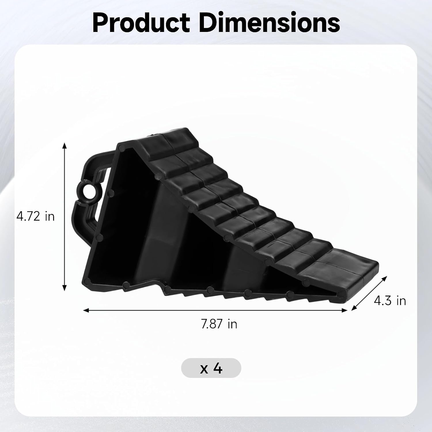 Color: Black Material: Plastic Size: Parking Chock: 7.87 x 4.72 x 4.3 in / 20 x 12 x 11 cm Package Includes: 4 x Parking Chocks Note: - Please refer to the measurement. Tiny measuring error is allowable in normal range. - There might be a little color difference due to the monitor, camera or other factors, please refer to the physical item.
