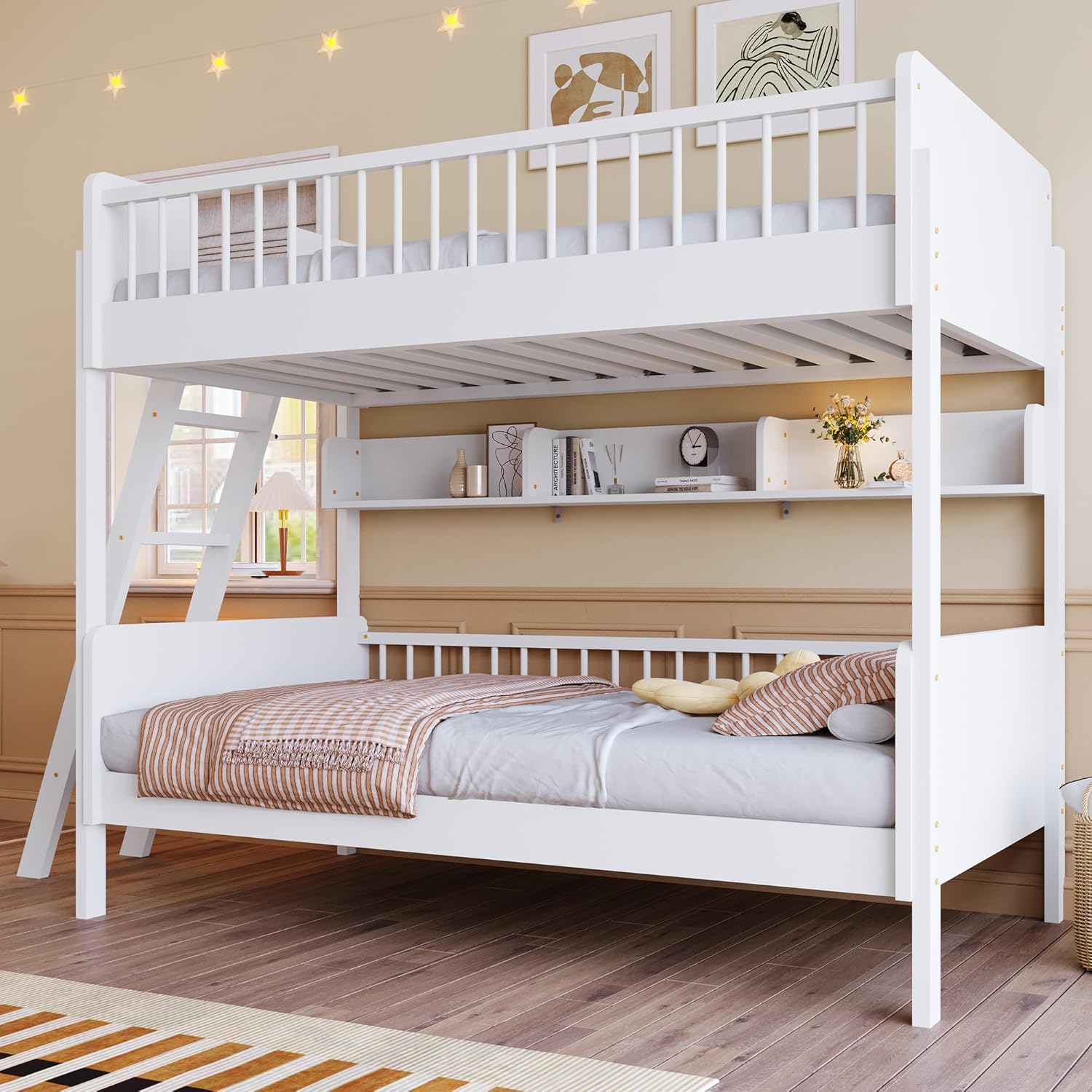 This solid wood twin over twin bunk bed efficiently saves space by accommodating two sleepers. It features integrated storage shelves for easy organization and includes full-length guardrails plus a sturdy ladder for safety. Built for long-lasting durability, its simple assembly makes setup straightforward. Ideal for shared kids' rooms or guest spaces. Product Name: Twin Bunk Bed Main Color: Natural/White Main Material: Solid Wood+MDF Overall Product Dimension: 94.4"L x 42.5"W x 63.7"H Number of Package: 2 Overall Product Weight: 145LBS Each Bed Weight Capacity: 400LBS Recommended Mattress Thickness: 4-6" Country of Origin: Vietnam