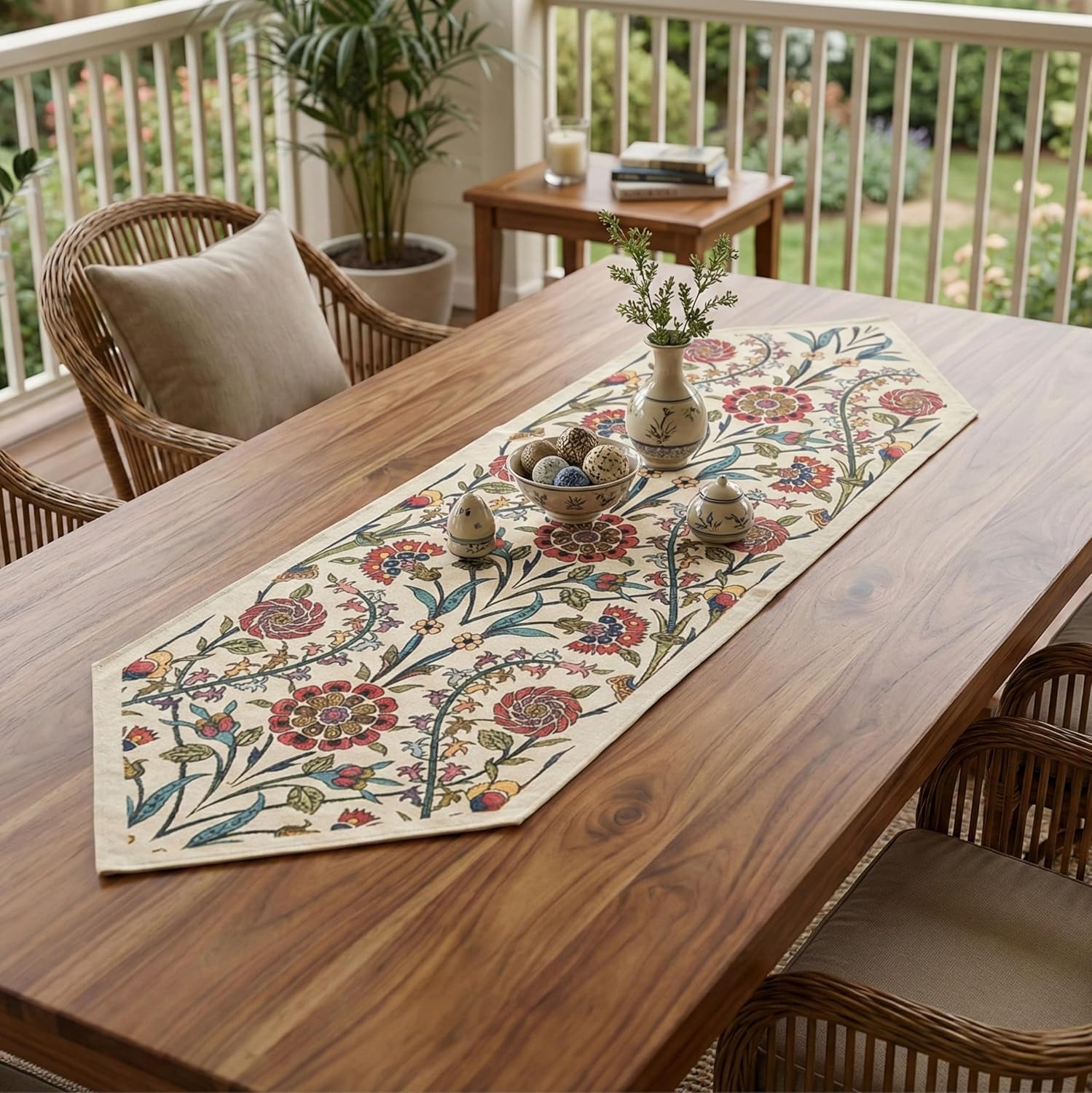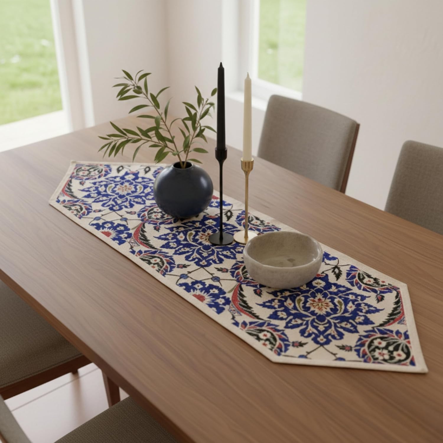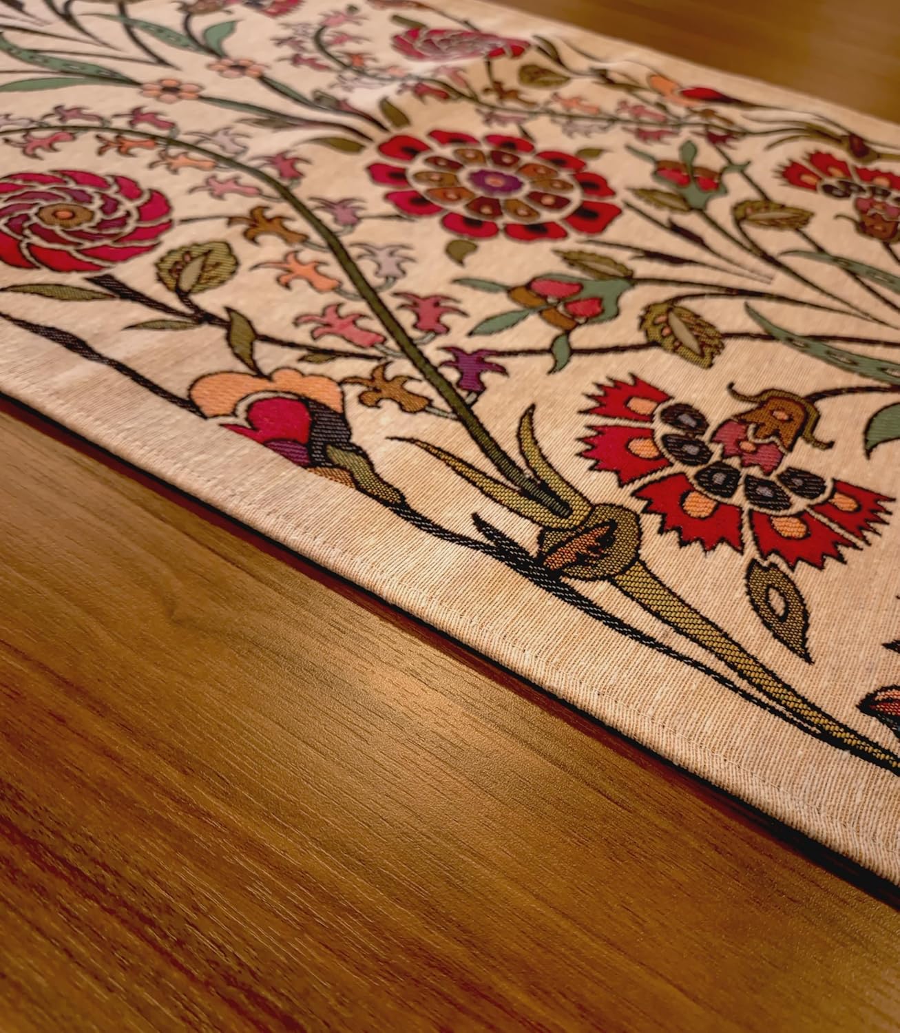 Rediscover the Art of Woven Textiles Transform your living space from ordinary to extraordinary with the Jacquard Woven Table Runner. In a market flooded with thin, disposable, and digitally printed fabrics, we return to the tradition of quality textiles. Our runners are not just colored on the surface; they are constructed thread by thread. Using the historic Gobelin (tapestry) weaving technique, every flower, geometric shape, and detail is created by the precise interlacing of yarns, resulting in a product that feels as premium as it looks. Why Choose Our Cotton-Blend Gobelin Runner? You shouldn't have to choose between beauty and practicality. Pure cotton can be high-maintenance and prone to wrinkling, while pure polyester often feels artificial and shiny. We have combined the best of both worlds: The Natural Foundation (60% Cotton): The structural warp of our runner is spun from cotton fibers. This forms the light beige background, giving the runner a natural, matte finish that mimics the look of vintage linens or burlap but with a softer, more refined touch. The Vibrant Detail (40% Polyester): The intricate patterns are woven with high-strength polyester weft yarns. This ensures that the vibrant colors of the design are locked in. They won't bleed in the wash or fade in the sunlight, ensuring your runner looks new for years to come. Designed for the Modern Home Whether you are dressing a long farmhouse dining table for Thanksgiving, adding a splash of color to a kitchen island for spring, or protecting the top of a wooden dresser from scratches, the runner fits seamlessly. The 72-denier yarn thickness provides a substantial feel—it doesn't slide off the table like satin, nor is it stiff like plastic. It lies flat, drapes elegantly, and withstands the rigors of daily family life. Technical Specifications: Weave Type: Jacquard / Gobelin Tapestry (Not Printed) Material Composition: ~60% Cotton (Warp), ~40% Polyester (Weft) Width: Approx. 18 inches (45 cm) – Please allow slight variations due to the weaving process. Length: Approx. 55 inches (140 cm) – Please allow slight variations due to the weaving process. Care Instructions: Machine wash gentle at 30°C (86°F), Do not bleach, Iron on low/medium heat. Origin: Expertly Woven in Turkey Add a touch of woven luxury to your home today.