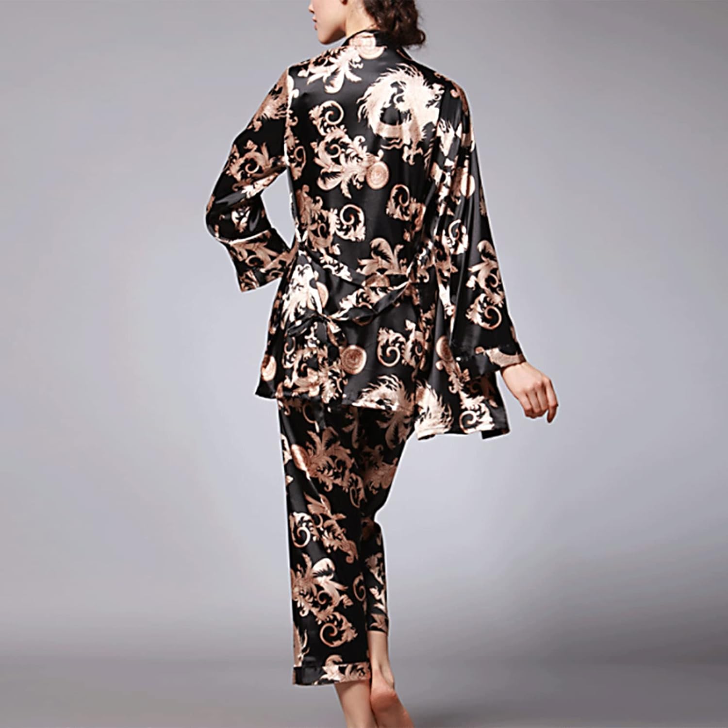 Lu's Chic Women's Satin Cami and Pant Pajamas Set with Robe 3Pcs Pj Silk V Neck Long Sleeve Camisole Sleepwear Slim Fit Dragon Patterned Print Nighty Loungewear Lace Belted Size ChartTag size M fits US size XSTag size L fits US size STag size XL fits US size MTag size 2XL fits US size LTag size 3XL fits US size XL