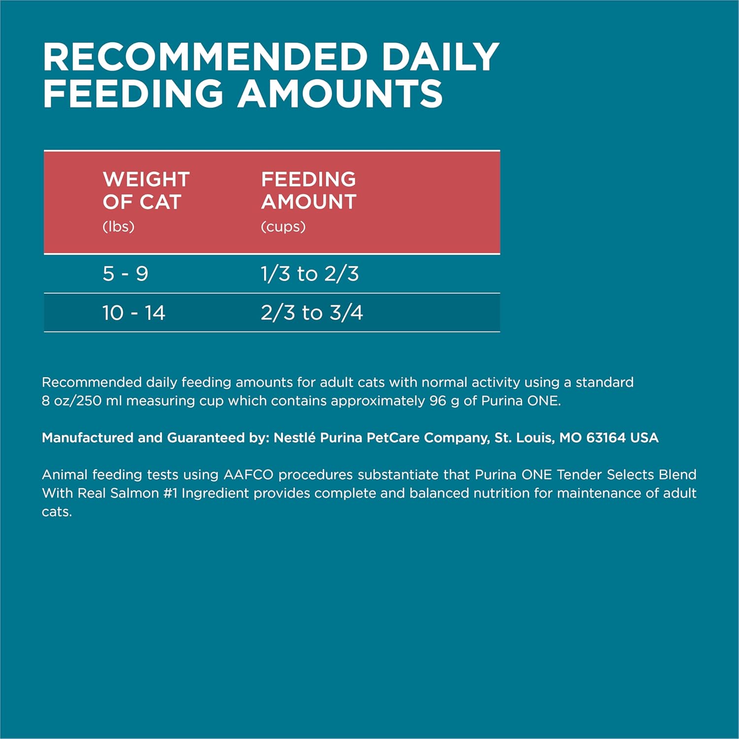 Give your cat the crunchy bites and meaty morsels she craves with Purina ONE Tender Selects Blend With Real Salmon adult dry cat food. What are the ingredients in Purina ONE? We craft Purina Tender Selects salmon cat food with a SmartBlend of real ingredients, including accents of carrots and peas. Salmon is the first ingredient in the digestive cat food, providing protein to help support strong muscles. This natural cat food with added vitamins, minerals and nutrients also has natural prebiotic fiber for gut health and immune system support. Plus, with added calcium, the crunchy cat food kibble helps maintain strong teeth. All Purina ONE cat food ingredients serve a purpose, creating a digestive health cat food with 0 percent fillers. Look to the bag for the calories per serving, feeding chart and instructions on changing cat food, and take our 28 Day Challenge to see the difference Purina ONE Tender Selects salmon cat food can make.