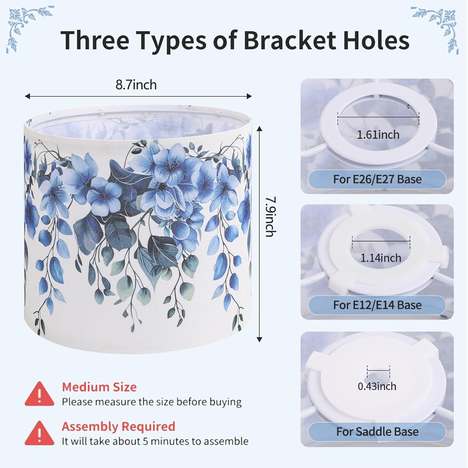 | Additional Features | 8.7''Top X 8.7'' Bottom X 7.9'' High, Cascading Blue Floral Print, Effortless Installation, Premium Linen Fabric with Soft Glow, Wide Compatibility for Various Lamps |