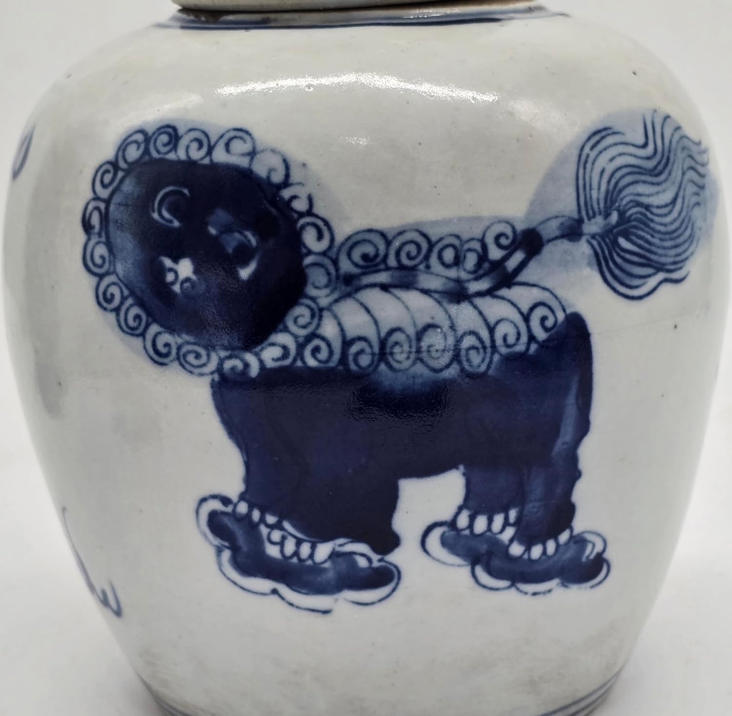 Made in Jingdezhen, China, this metro traditional Chinese blue and white porcelain lion dancing covered ginger jar is an antique style collection with a touch of Ming dynasty glory. It is made retro, like old and used. It is popular both for collection and decoration.