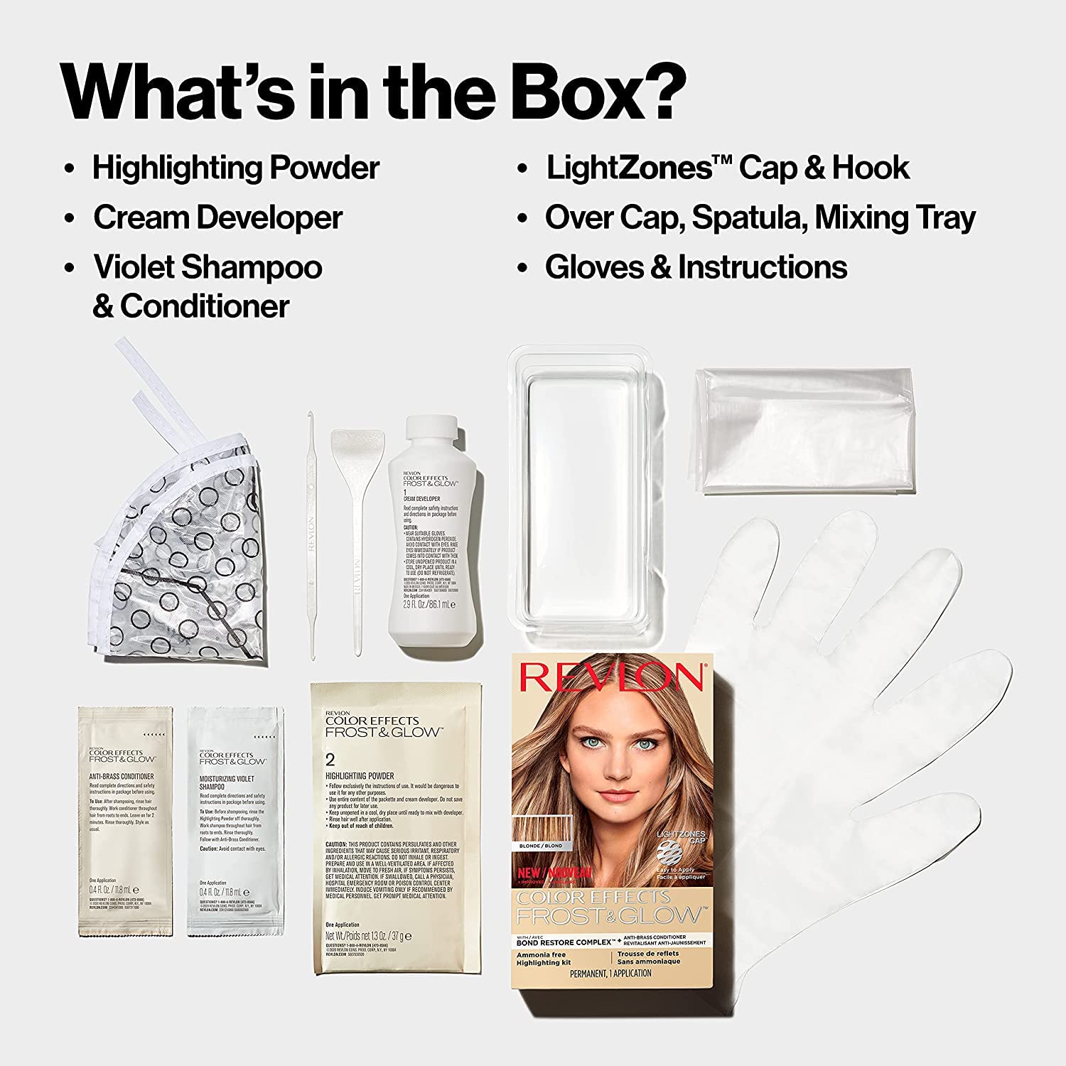 Revlon Color Effects Frost & Glow All-In-One Highlighting Kit, Blonde 1 ea (Pack of 3) - Revlon Color Effects Frost & Glow highlights provide gorgeous, on-trend, salon-inspired effects that can be created easily at home. Its unique formula with Keratin Moisture Complex penetrates hair to nourish, protect, and moisturize, giving you silky, healthy-looking hair from the inside out. Frost & Glow highlights can be used on natural, color-treated, or permed hair. Includes the Revlon Create-A-Look Hook for creating customized looks and the LightZones Cap for customizing your highlights. Available for Honey, Blonde, and Platinum. Revlon is a global leader in cosmetics, hair color, fragrances, skincare, and beauty care products. One of the strongest consumer brand franchises in the world, Revlon’s products is sold in over 100 countries across six continents. Revlon revitalized the industry over the years with iconic nail and lip colors and with breakthrough technology like ColorStay transfer-resistant lipstick and makeup. Instructions: Please follow the box instructions closely, but here are a few important points you might want to know right now about this at-home hair bleach kit which includes everything you need. Our hair experts advise not washing your hair right before you color it. Apply the Color Effects Frost & Glow formula when your hair is clean and dry. Put on the cap provided. Pull hair strands through where you’d like highlights. Slip on the gloves provided and apply the formula to the hair that has been pulled through the cap. Put on the provided Over Cap over the hair. Check your hair every 5-10 minutes until you've reached your desired highlight color. Do not exceed 60 minutes. Once your desired lightness is reached, rinse hair, shampoo, and apply violet conditioner for anti-brass results.