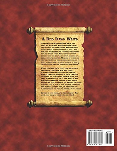 The crimson mist churns a hundred miles from shore, red with the blood of a butchered world. Here in the Sunset Isles the last fragments of humanity struggle to withstand the fury of the native Shou and the corruption within their own divided ranks. Hard-eyed men and women brood in the waterfront dives and shabby tea houses, selling their swords for a few bright coins or the promise of a dead man's treasures. In the wilderness, the lost cities of vanished empires and fallen races lie deep within the jungle shroud, and the desperate efforts of colonists and refugees strain to contain the horrors that threaten on every side.It is a time for legends. It is a time for fearless warriors and eldritch adepts to rise from this hard-pressed people and defend them from the nightmare that threatens to engulf them all. The wealth of ages awaits those steely souls with the courage to cast down the guardians and break the vaults of the festering dead. A new world struggles to be born from the red ruin of the old. It is in need of scarlet heroes.Scarlet Heroes is an old-school tabletop role-playing game designed to provide classic sword and sorcery gaming for one player and one gamemaster. Unlike most other RPGs, Scarlet Heroes is built to support one-on-one play, with no need for a full-fledged party of adventurers to provide an evening's entertainment. Whether for a spouse, kid, curious friend, or just as an alternative to boardgames for those nights when only one or two friends can make it to the gaming session, Scarlet Heroes gives you the tools for good old-fashioned skull-cracking adventure. Scarlet Heroes can be used both as a stand-alone RPG and as an overlay over your favorite old-school game to make its adventures playable for single PCs or very small groups. It shares the same classic statistics and basic game mechanisms as these old-school favorites, but by changing the interpretation of these numbers it makes it possible for a single courageous adventurer to dare perils that would otherwise threaten a half-dozen freebooters. With Scarlet Heroes, a GM can pull out a favorite module, grab a convenient friend, and a have a full night's adventure with no tweaking, alteration, or adjustment of the material needed. Inside the pages of this book, you'll find... * A full stand-alone RPG system that can also be used as an overlay atop most popular old-school games. * The Red Tide campaign setting as a default for the game, with a full bestiary of Southeast Asian-inspired monsters, suitable new magic items, and a full list of new cleric and magic-user spells for that setting. * Sixty new adventure tags of the sort beloved in Stars Without Number and the Red Tide Campaign Setting sourcebook. Mix and match to fashion your own perilous circumstance. * Solo adventure tools for genuine single-player RPG gaming. Mix your own creativity with table results to create a narrative for your own hero's adventure... or use them as inspiration in crafting something for a group. * Five crisp new maps by Dyson Logos, unkeyed and ready to be filled by your own creativity. More than a thousand backers supported the Kickstarter campaign that funded the creation of Scarlet Heroes and now the book is available to the wider world. Seize this world of red adventure and be armed against the coming night! Read more