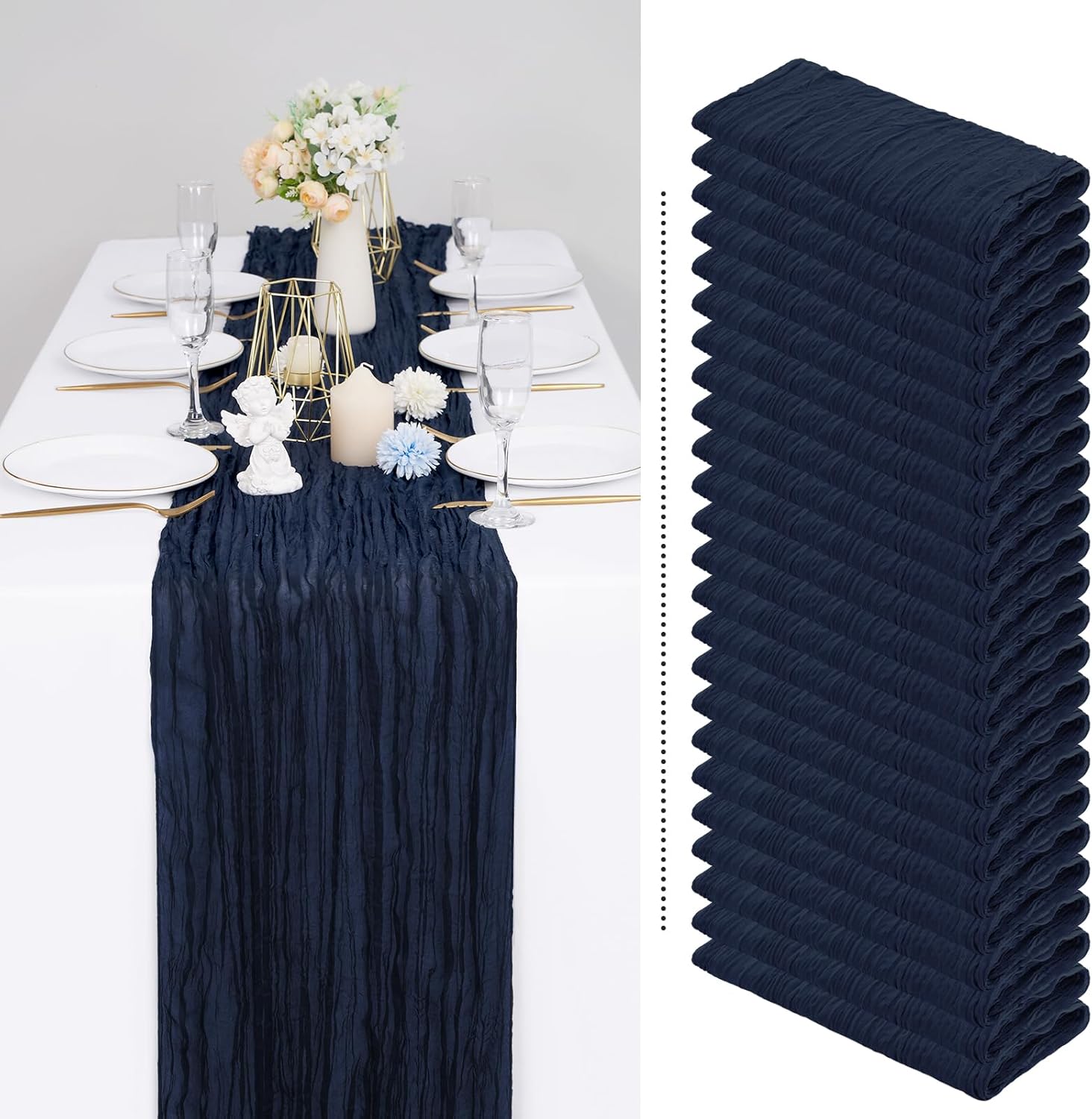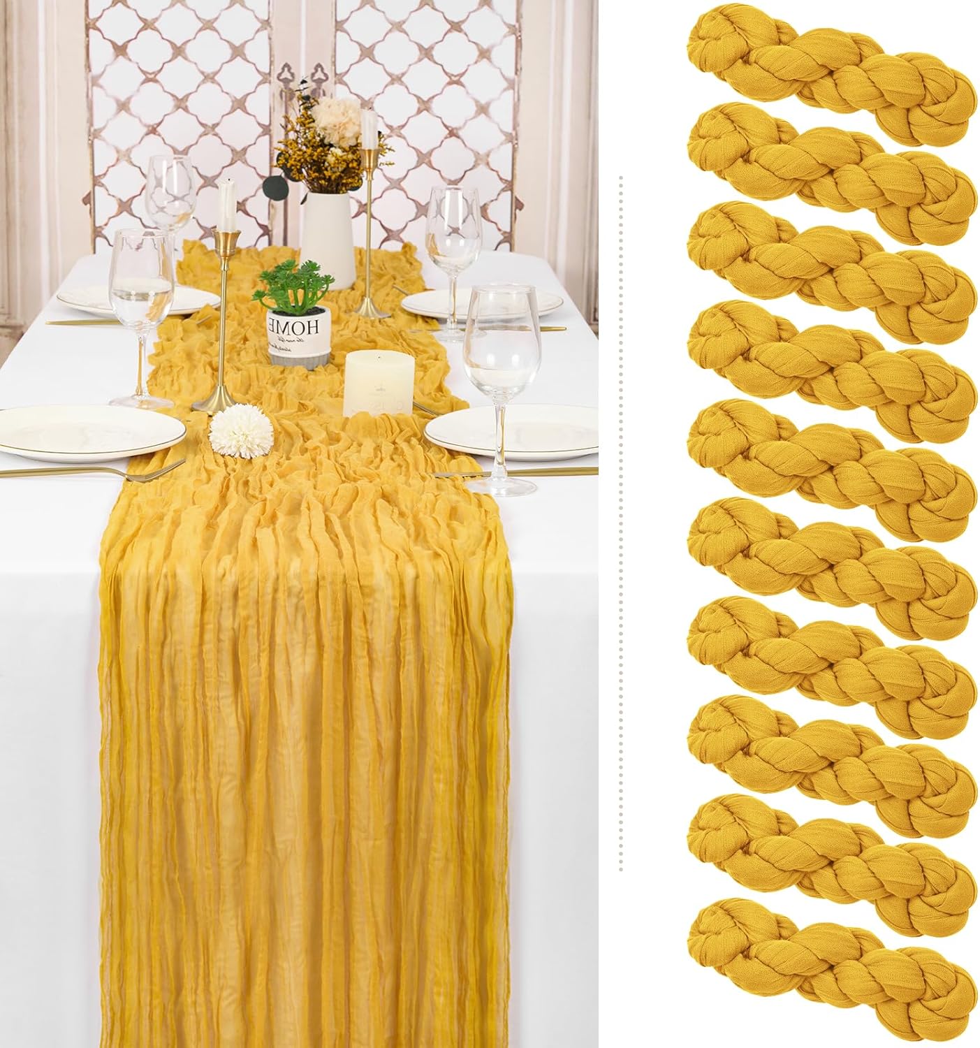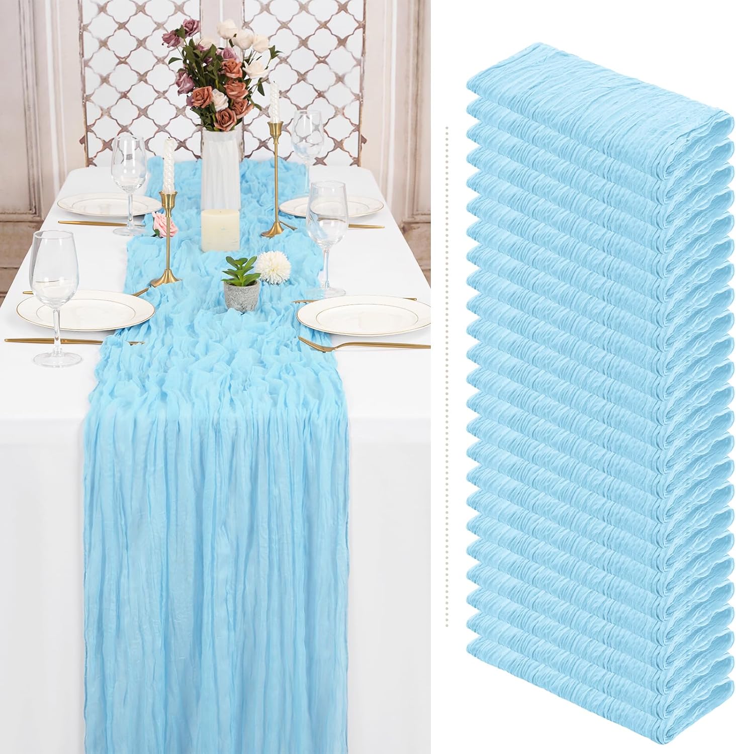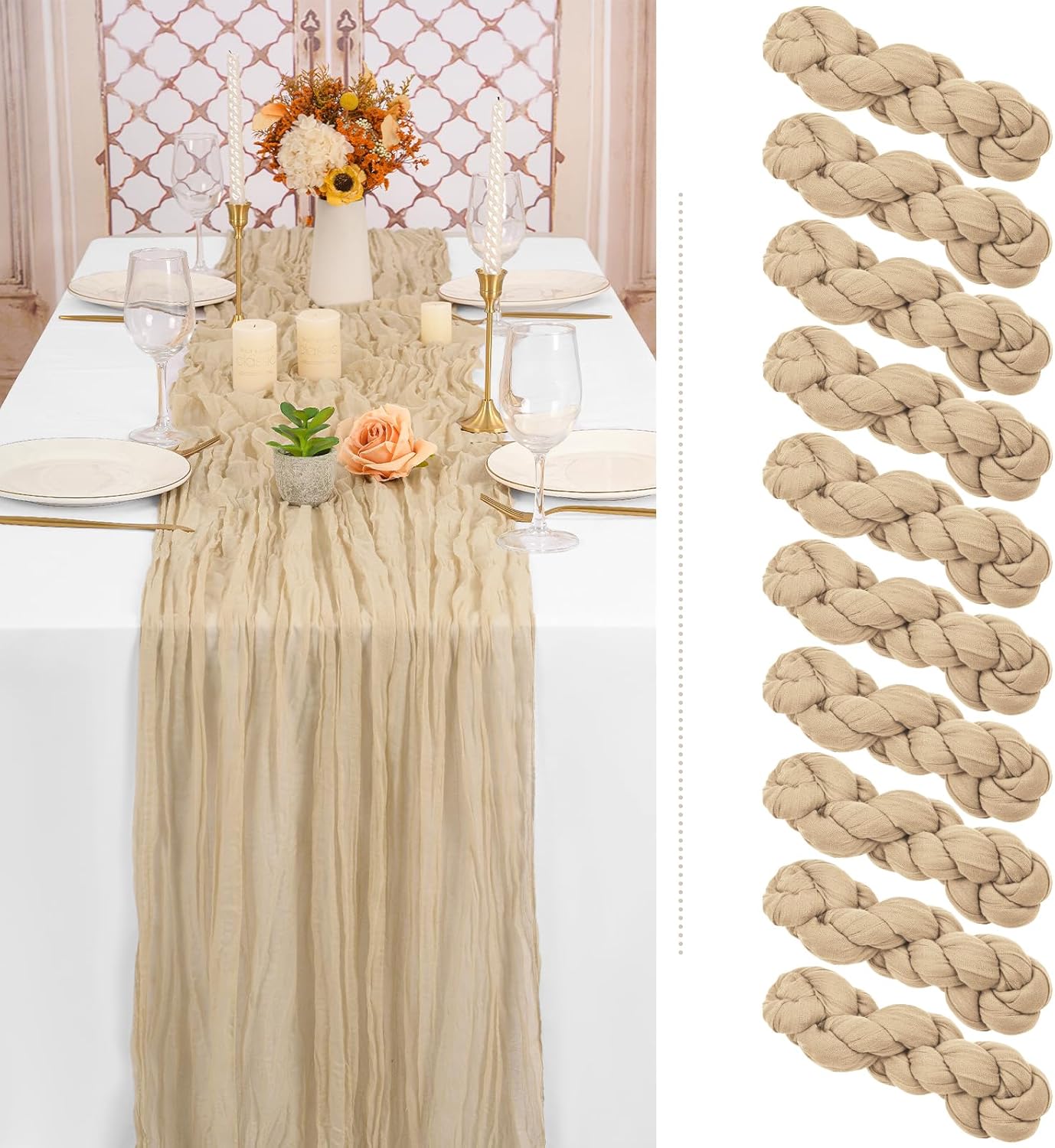 18 Pack Cheesecloth Table Runner Linen Table Runner Rustic Table RunnerColors: Terracotta, Beige, Sage Green, Dusty Blue, Dusty Pink...Material: 100% natural cheesecloth fabric.Size: 35 inches wide and 120 inches longFeatures:Soft to the touch, naturally pleated and reusable.The natural drooping feeling flows to the floor, making people eye-catching.It is easy to use and save time, and it is very convenient to fold it for storage.Not only can be used as a tablecloth table runner, it is a retro and elegant decoration.Multipurpose:wedding archphotography backgroundfloral decorationArtwork decorationchair beltawningcurtainUse occasions:weddingbanquetbridal showercandlelight dinnerafternoon teavalentine datefamily dinnerCare instructions:Do not dry clean, do not use bleach.Hand wash or machine wash in a laundry bag, lay flat to dry.Reminder:1. Manual measurement, there will be 1-2cm error, please understand.2. The computer screen and the mobile phone screen display different colors, and there will be color differences.