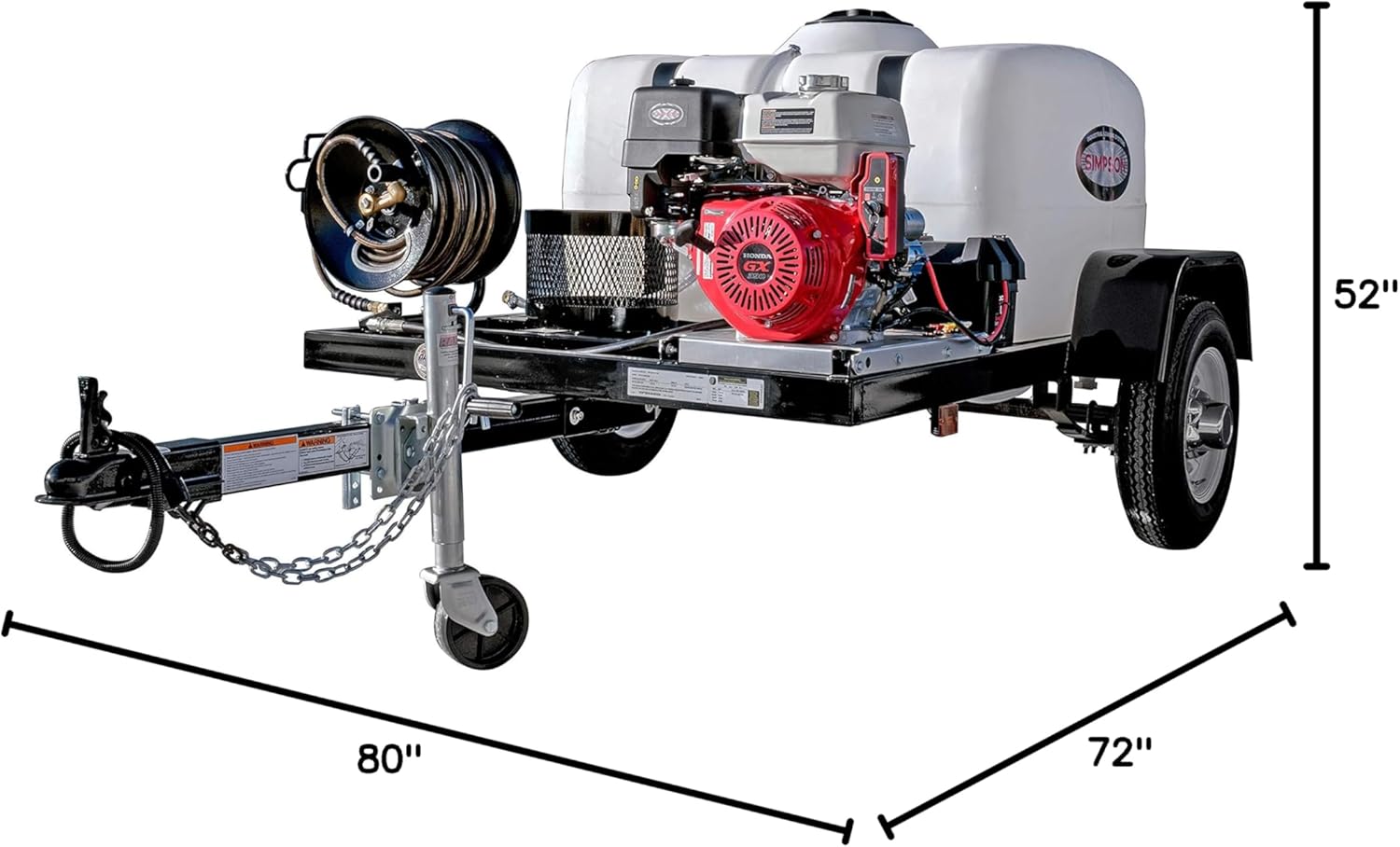 This powerful SIMPSON mobile pressure washing system will handle all your commercial jobs. It is perfectly suited for contract cleaners, mobile detailers, municipalities and resorts. The trailer is dot certified as an over-the-road pressure washer system. Job-Site set-up is a snap. Pull up to the work area, connect the spray gun, start the engine and begin cleaning. Designed to surpass expectations, the SIMPSON mobile pressure washer 4200 PSI at 4. 0 GPM is a self-contained cleaning machine. Engineered to utilize the power and performance from top of the line SIMPSON pressure washers matched with the portability of a utility trailer. The 95003 is run by a Honda engine and comes with a 100’ hose, an ergonomic spray gun and 5 Quick-Connect nozzles. This mobile system brings a cleaning solution into the field where a water supply isn’t there. This powerful SIMPSON mobile pressure washing system will handle all your commercial jobs. It is perfectly suited for contract cleaners, mobile detailers, municipalities and resorts. The trailer is dot certified as an over-the-road pressure washer system. Job-Site set-up is a snap. Pull up to the work area, connect the spray gun, start the engine and begin cleaning. Engine - 3 Year Limited Commercial Warranty | Pump - 5 Year Limited Warranty | Frame - 1 Year Limited Warranty