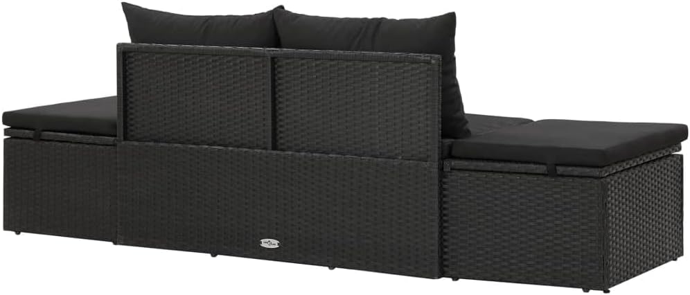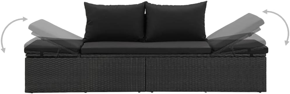 This comfortable poly rattan lounge bed is a perfect combination of style and functionality. It will be ideal for relaxing near the swimming pool, at your balcony, on your patio or at the campsite during your holiday or leisure time.Our sun bed is made of PE rattan, which is lightweight, water-resistant, easy to clean and designed to be used outdoors for year round. Powder-coated steel frame ensures high stability. Both sides of the bed can be pulled up and adjusted in different settings for the most comfortable seating or lying position. The thickly padded, removable cushion and waist pillows with foam filling will provide the ultimate comfort. The cushion cover is removable for easy washing and maintenance.The sun bed is easy to assemble.Color: BlackMaterial: Steel frame + poly rattanDimension: 76.7" x 23.6" x 23.6" (L x W x H)Seat height: 12.6"Seat cushion thickness: 1.6"Waist pillow dimensions: 21.6" x 13.3" x 5.9" (L x W x T)Both sides are adjustable