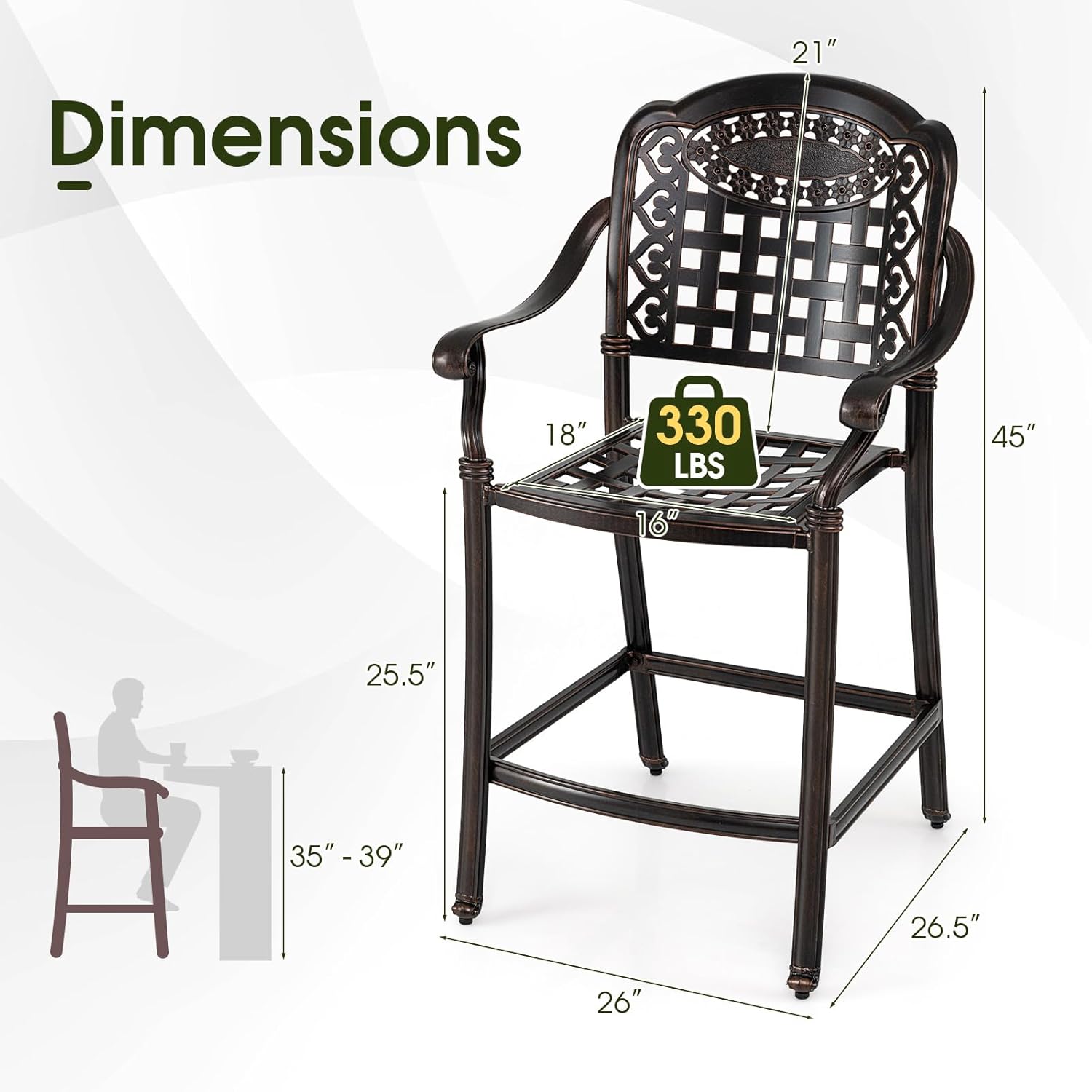 Description:Enhance your outdoor living space with stylish and enduring outdoor bar stool seating that combines elegance, comfort, and stability. This set of premium patio bar stools offers the perfect blend of functionality and artistic detailing to elevate any patio or porch setting. Crafted from high-quality cast aluminum, these stools withstand harsh weather and resist rust while supporting up to 330 lbs per seat for reliable durability. The contoured seat with built-in armrests and a supportive high backrest makes these patio stools exceptionally comfortable for long, relaxing chats. Featuring intricate floral mesh and scrollwork, the antique copper finish of these outdoor aluminum stools cast beautiful shadows and adds timeless elegance. Adjustable foot pads provide stability on uneven surfaces, and an integrated footrest enhances comfort, making these stools versatile for various outdoor settings!Features:High-quality cast aluminum material is high-strength and weather-resistantBeats rusty metal, perishable wood and flimsy rattan in longevityWaterproof surface is easy-to-maintainErgonomic design provides adequate support for your back, arms, hips and feetReclined backrest, curved armrests and contoured seat fit your bodySturdy construction is fitted with adjustable foot pads for added stabilitySturdy frame with footrests for a relaxed seating postureExquisite hollow-out design can elevate your outdoor spacePerfect addition to your patio, porch, backyard and poolside areasAssembly neededSpecifications:Color: BronzeMaterial: Cast AluminumOverall Dimensions: 26.5" x 26" x 45" (L x W x H)Seat Dimensions: 16" x 18" x 25.5" (W x D x H)Backrest Height: 21"Compatible Counter Height: 35"-39"Weight Capacity: 330 lbsNet Weight of Stools: 17.5 lbsPackage Includes:2 x Bar Stools1 x User Manual