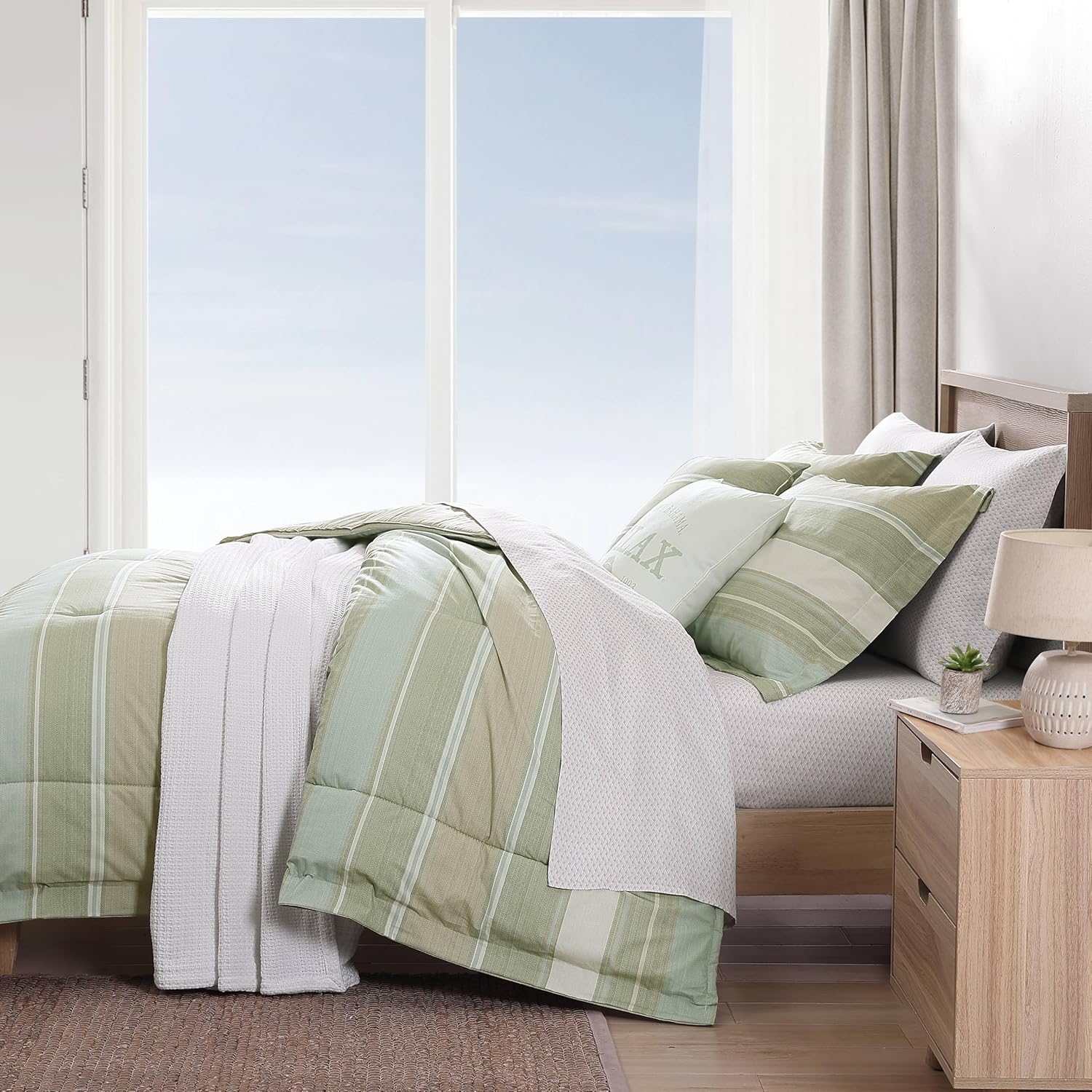 Update your bedroom décor with a new comforter set from Tommy Bahama. Constructed with quality cotton, the Serenity 5 Piece Comforter Set features a casual stripe design in shades of green and cream on the ground of the comforter, coordinating shams and one of the decorative pillows. The other included decorative pillow features the signature Tommy Bahama logo and the mantra "Relax" in green on the white ground. Comforter features a polyester fill and the set is machine washable for easy care. Ensemble is fully reversible for versatile bedroom looks. Queen comforter set includes: One comforter (96"L x 92"W), two standard shams (21"L x 27"W) and two throw pillows (18"L x 18"W) and (16"L x 16"W). King comforter set includes: One comforter (96"L x 110"W), two king shams (21"L x 37"W) and two throw pillows (18"L x 18"W) and (16"L x 16"W).