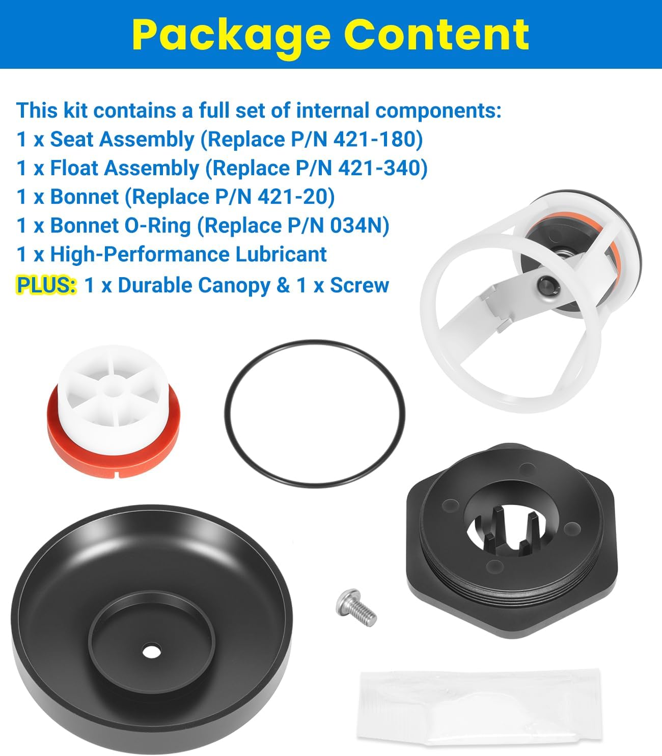 Restore Your Water System with the Professional RK12-420 Repair Kit Maintain the integrity of your backflow prevention system with this all-inclusive RK12-420 Complete Repair Kit. Specifically engineered for Zurn Wilkins Model 420 and 420XL Pressure Vacuum Breakers (PVB), this kit is the ultimate solution for fixing persistent leaks, restoring internal pressure balance, and repairing winter freeze damage. Compatibility: For Zurn Wilkins 420 & 420XL Series (1/2" and 3/4" Models) Complete Components List (Replaces 421-180, 421-340, 421-20): 1 x Seat Assembly (Replace P/N 421-180) 1 x Float Assembly (Replace P/N 421-340) 1 x Bonnet (Replace P/N 421-20) 1 x Bonnet O-Ring (Replace P/N 034N) 1 x High-Performance Lubricant PLUS: 1 x Durable Canopy & 1 x Screw