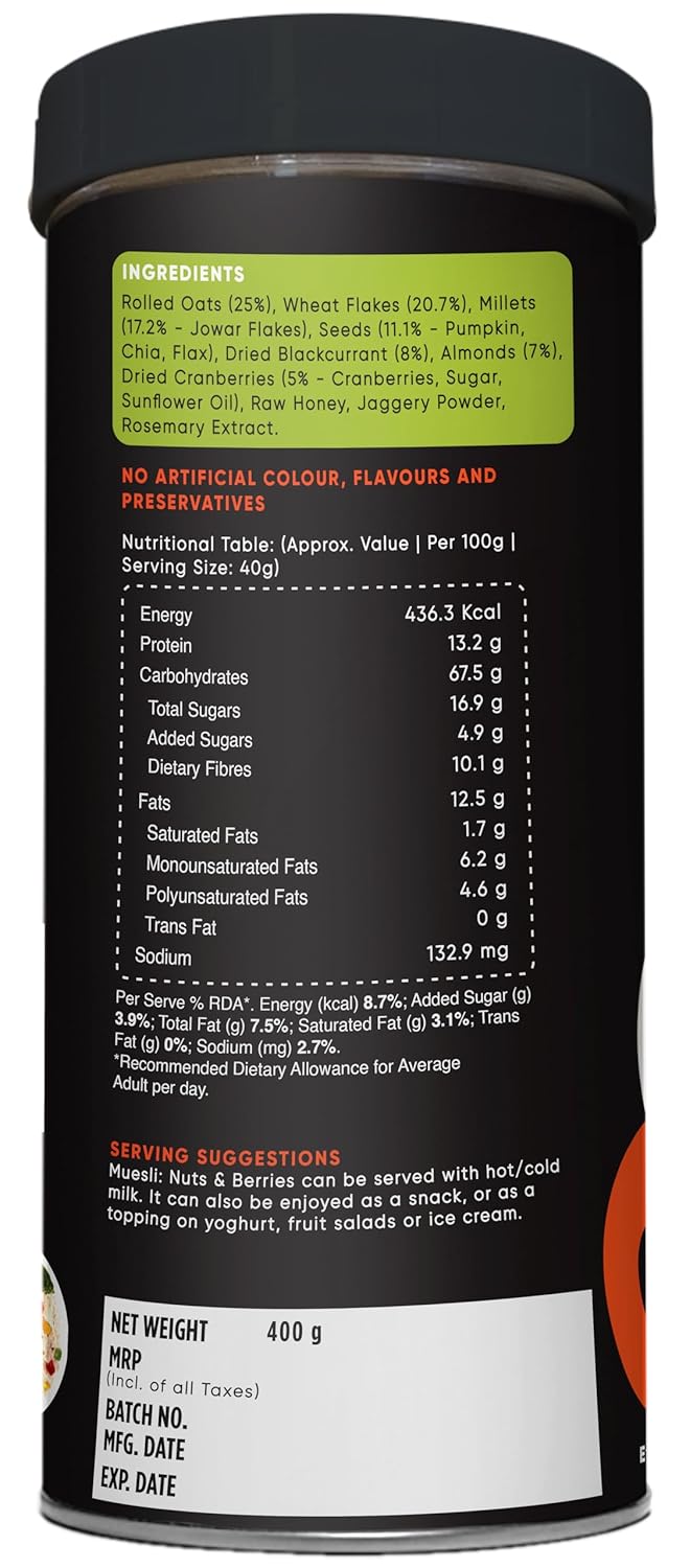 • Ingredient Composition: Made with rolled oats, wheat flakes, millets, seeds, and dried fruits, this muesli offers a symphony of flavors and textures in every bite