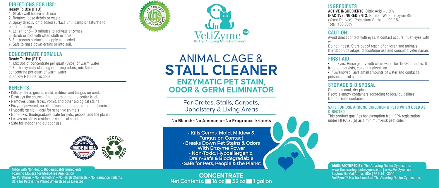 VetiZyme Animal Cage & Stall Cleaner is the natural sanitation solution for homes, barns, and facilities. It doesn’t just clean—it also sanitizes, disinfects, and eliminates harmful germs and bacteria, while being completely safe for pets and livestock. Powered by enzyme technology, VetiZyme penetrates organic buildup, neutralizes ammonia odors, and remove mold and mildew at the source.It creates a fresher, healthier environment for animals and caretakers without harsh chemicals. ✅ Cleans & Disinfects: Sanitizes habitats and remove germs, bacteria, mold & mildew ✅ Enzyme Action: Breaks down urine, waste & ammonia odors naturally ✅ Safe & Non-Toxic: Biodegradable, chemical-free, safe for pets & livestock ✅ Dual Purpose: Odor eliminator + disinfectant + cleaner in one ✅ Professional Strength: Trusted by vets, shelters, groomers, equestrian barns & farms