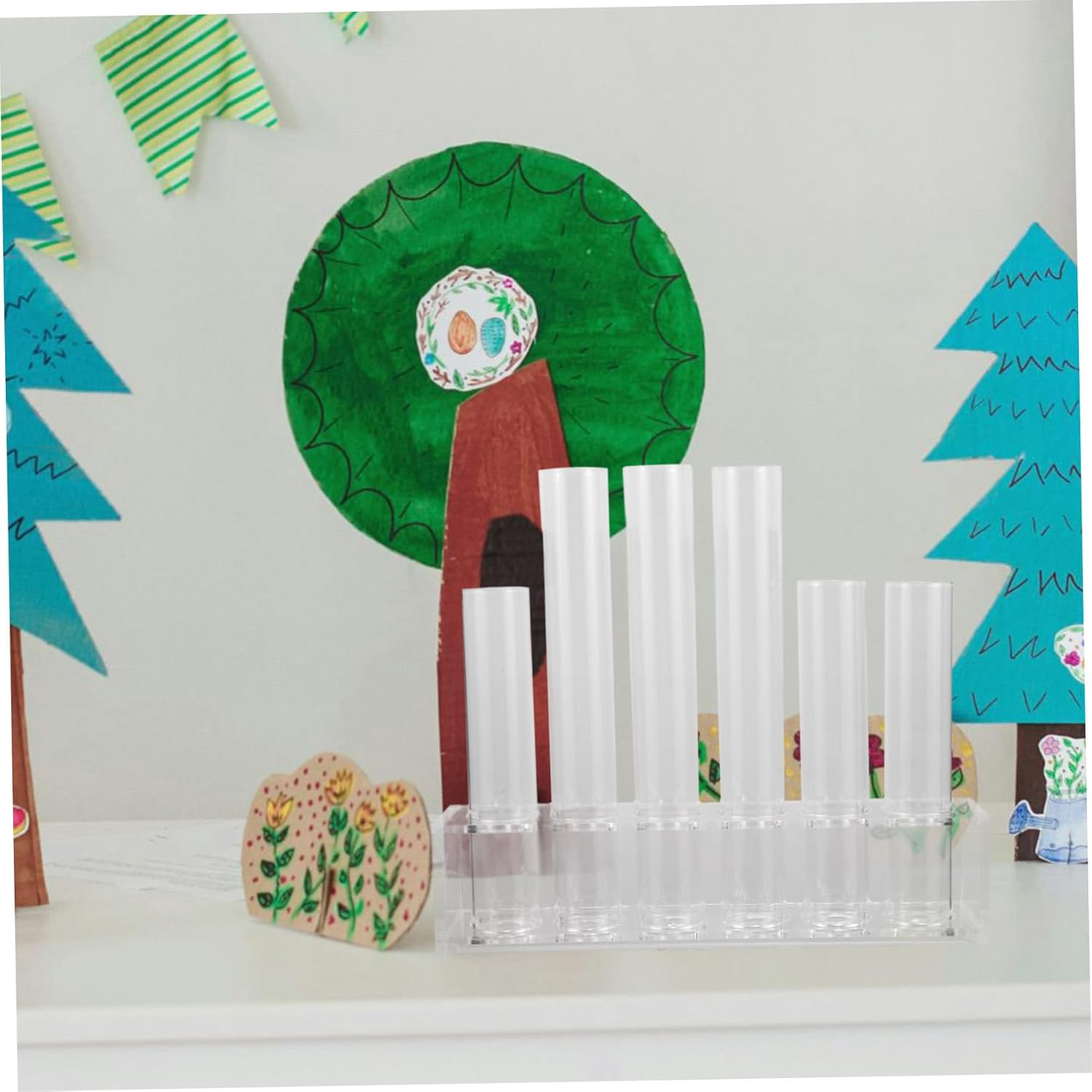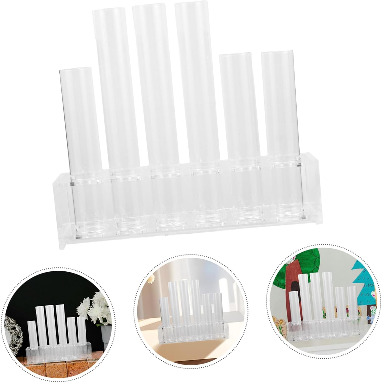 Package List 1 x Tube Rack 6 x Tubes Characteristics -Size:15.00X3.00X3.00cm/5.89X1.18X1.18in tube for plants -Size:20.00X3.00X3.00cm/7.86X1.18X1.18in propagation tubes -Material:Plastic,Glass transparent glass tube -Color:Transparent glass tubes -Size:23.50X9.00X6.00cm/9.24X3.54X2.36in starter glass tubes - Easy to match, you can decorate your favorite hydroponic flowers in the vase as you like glass tube. - Great for home, office, garden, wedding decoration, beautify and purify your environment desk propagation station. - The space-saving flower tube is a great place to grow your flower and easy to take care water tubes for flowers. - Manufactured with glass and plastic material, anti-wear and long using time flower water tubes. - A nice touch to any room, put it on , desktop, shelf, bedside for decoration in room, ding room propagation vases.Goods Descriptionglass desk vase Simple design with creative look makes it attractive.tubes It can be your room decor.test tubes glass want to appreciate your at any corner? This item is a creative hydroponic glass vase, made of and clear glass material,with plastic tube rack, which can be clear, and
