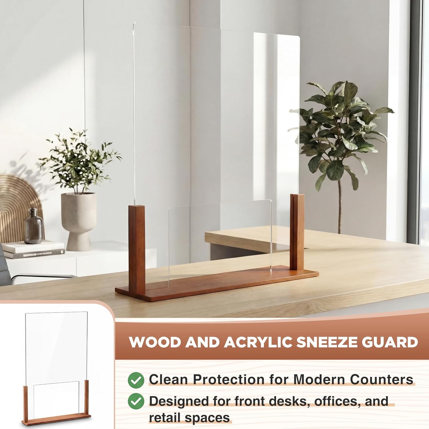 Features: Elevate safety in your workspace with our sneeze shield for office and restaurant, a stylish yet functional protective shield suitable for various decorating styles, including modern and minimalist. Whether you're managing a busy checkout, a reception desk, or a testing center, this shield against sneezing and coughing provides a reliable shield to safeguard interactions. Specifications: Material: wood and acrylic Color: oak, clear Size: about 24" x 16" Package includes: 1 x Wood and acrylic sneeze shield for counter Notes: Manual measurement, please allow slight errors on size. The color may exist a slight difference due to different screen displays